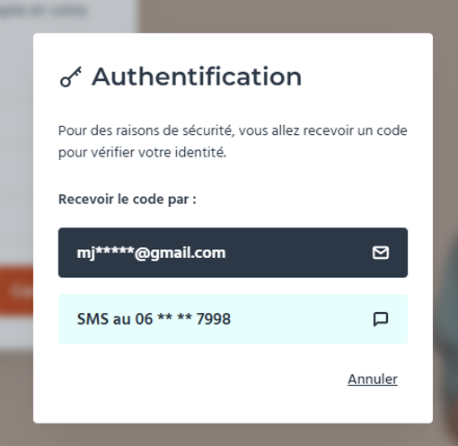 Avant de modifier votre mot de passe, vous allez recevoir un code pour vérifier votre identité. Nous avons mis en place cette méthode d'authentification forte pour des raisons de sécurité et pour vous éviter d'éventuels désagréments. Nous vous laissons choisir le mode d'acheminement de ce code.
